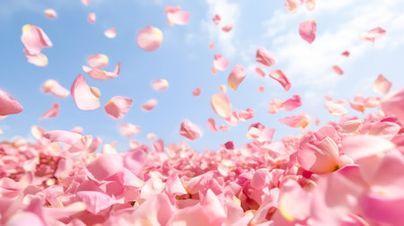 Gently floating in the air, pink rose petals contrast beautifully with a soft blue sky offering a serene and picturesque view of nature's delicate charm