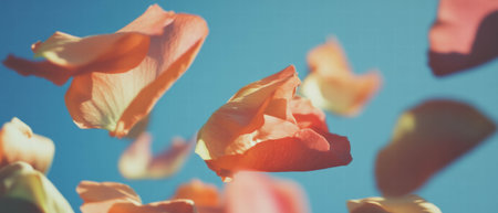 petal flowers confetti falling from a bright blue sky on an autumn or spring professional photography