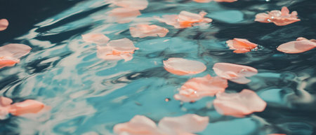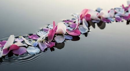 Petals gently floating on a serene water surface creating a peaceful atmosphere