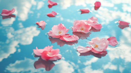 Pink flower petals floating on calm water with reflections of clouds on a sunny day