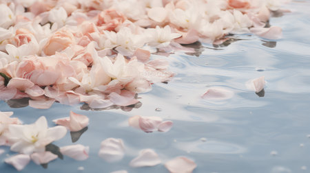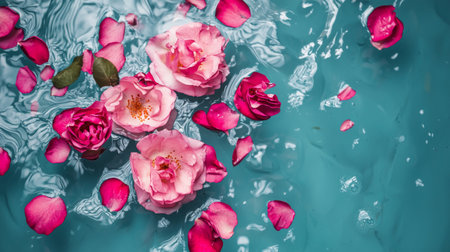 Pink roses and petals floating on the surface of calm water, creating a peaceful and serene composition that evokes a sense of tranquility.