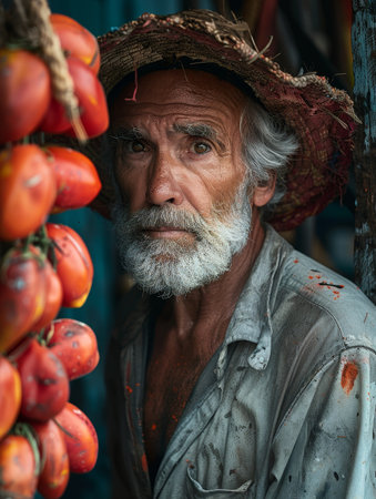 Weathered fisherman sharing personal stories with vibrant characters, in a scene of authentic lifestyles and spontaneous embraces