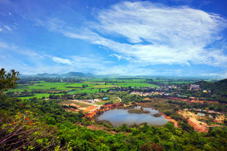 Landscape photo in high angle view of fertile farming community in rural Thailand under bright blue sky and white clouds.