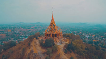 aerial view beautiful golden sunrise the palace in Phetchaburi city on hilltop.