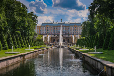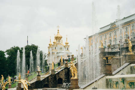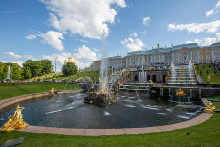 St. Petersburg, Russia-August 31, 2019: Grand Palace and Golden fountains in Peterhof