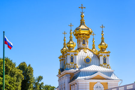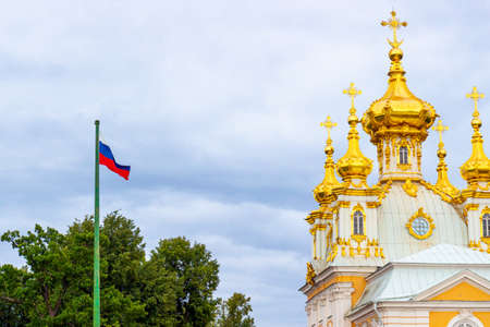 Petergof, Saint Petersburg, Russia - 12 August, 2020: Waving Russian flag and golden domes of the Church of Peter and Paul in the Great Peterhof Palace against the cloudy sky