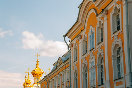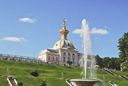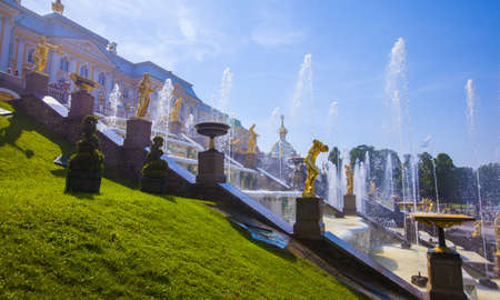 ST PETERSBURG, RUSSIA - JUNE 15, 2014: Peterhof Palace (Petrodvorets) on the blue sky background. The Peterhof Palace included in the UNESCO's World Heritage List.