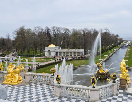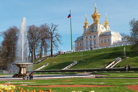Peterhof, St. Petersburg, Russia - May 7, 2016: Tourists walking and resting near the French fountain against Grand Palace. The palace was built in 1715-1725 and then enlarged in 1745-1755 by Francesco Bartolomeo Rastrelli