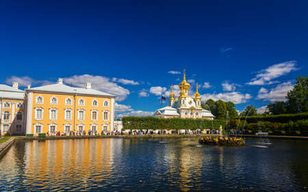 PETERHOF, ST. PETERSBURG, RUSSIA - MAY 4, 2015: East Chapel flanking the central buildings of Grand Peterhof Palace with reflection