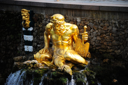 Saint Petersburg, Russia - 18 September 2015 - Neptune fountaine in the upper garden in Peterhof.