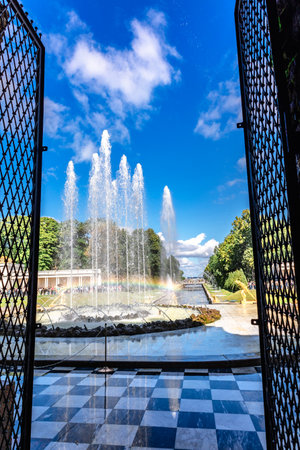 Saint Petersburg, Russia - Circa June 2017: View of the Grand Cascade, Peterhof Palace. The Peterhof Palace and Garden Complex is UNESCO World Heritage Site, famous tourist place