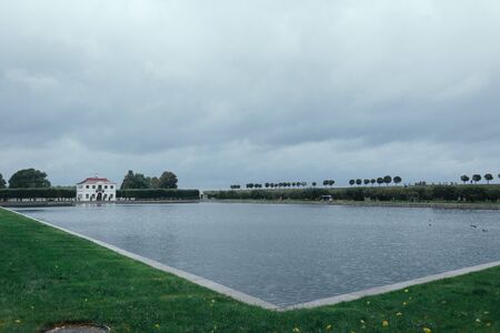 Peterhof (Petergof) which hosts Grand Peterhof Palace on a rainy day. Saint Petersburg, Russia - august, 2021. High quality photo