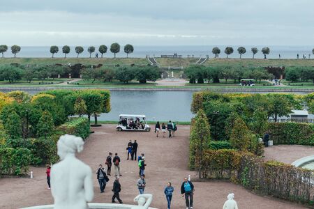 Peterhof, Russia: August, 2021 - the palace park. Tourists visiting the landmark of St. Petersburg. High quality photo