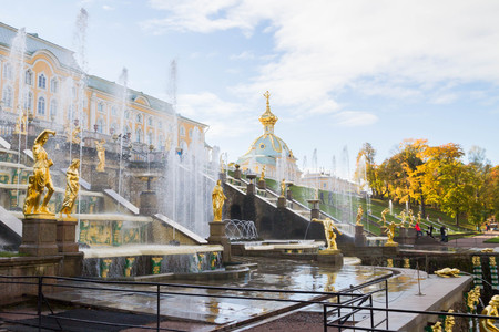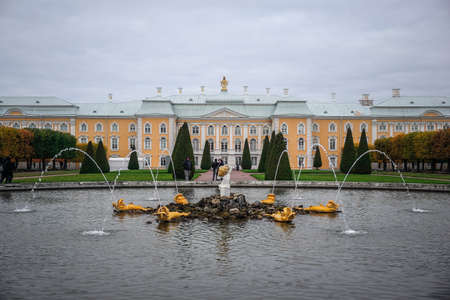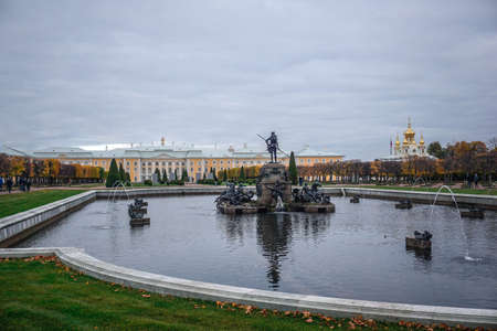 Russia, St. Petersburg, city of Petrodvorets, October 10, 2015. Grand Palace fountains in the Park of the town of Peterhof.