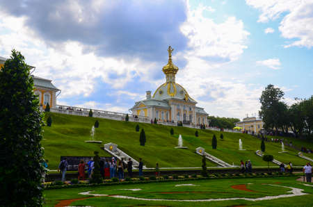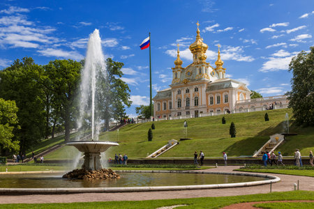 Saint Petersburg, Russia - May 2019: Peterhof fountains and palace view and tourists. The Peterhof Palace is a series of palaces and gardens and a popular tourist sight.