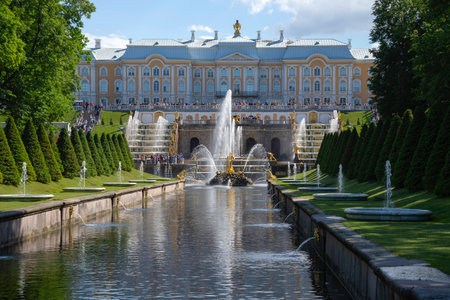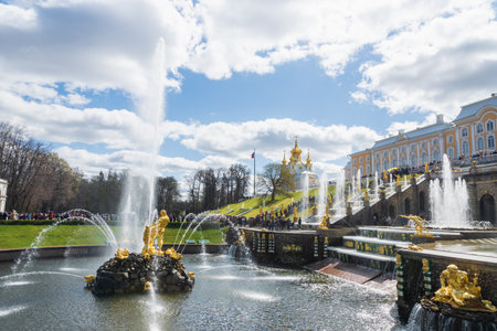 Saint Petersburg, Russia - May 2019: Peterhof fountains and palace view and tourists visiting the Lower Park. The Peterhof Palace is a series of palaces and gardens and a popular tourist sight.