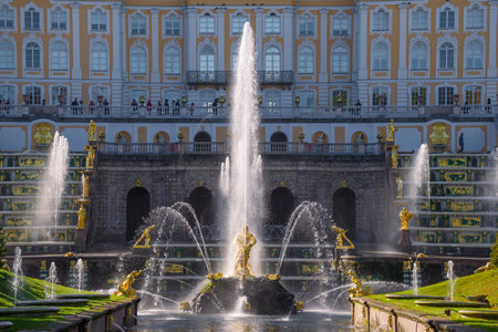 Saint Petersburg, Russia - Circa June 2017: Grand cascade in Pertergof or Peterhof in St. Petersburg, known as Petrodvorets from 1944 to 1997. Famous tourist place with golden statues