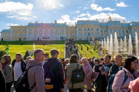 Saint-Petersburg - Russia October 4, 2022: Petergof. Grand Palace, fountains and many tourists in the lower park of Peterhof on a bright sunny day.