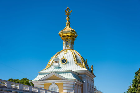 Golden dome of the Great Cascade inside of the summer palace of peter the great in Saint Pertersburg, Russia.