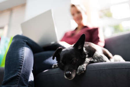 Dog Sitting Next To Cheerful Owner Using Laptop At Home.