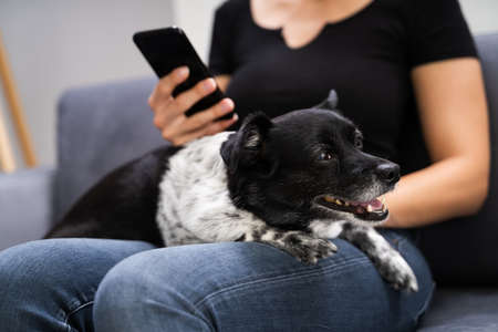 Woman photographing on cell phone dirty, dog outdoors in nature.