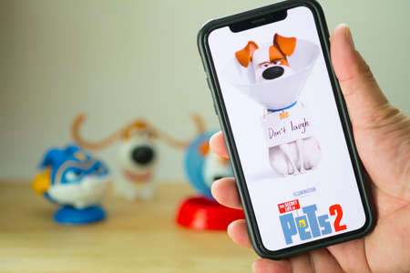 Bangkok, Thailand - June 2, 2019 : The Secret Life of Pets 2 movie is an American 3D comedy film produced by Illumination Entertainment. Poster show cinima on mobile I-Phone X screen