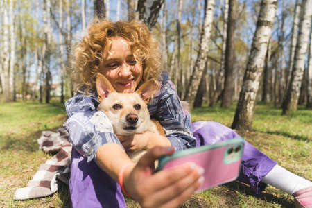 Close-up shot of a joyful beautiful caucasian curly-haired girl sitting on the grass in a park holding a mobile phone, taking a picture of her and her dog. High quality photo