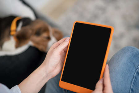 Pet owner hanging out with his dog on the couch sofa, while surfing the internet on his tablet device