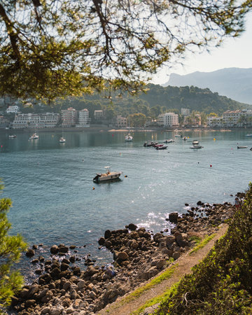 Picturesque view of moored motor boats, yachts along coast Port de Soller, Spain. Calm sea surface, sunny day atmosphere maritime romance. Travel, vacation at sea, yachting, coastal life.