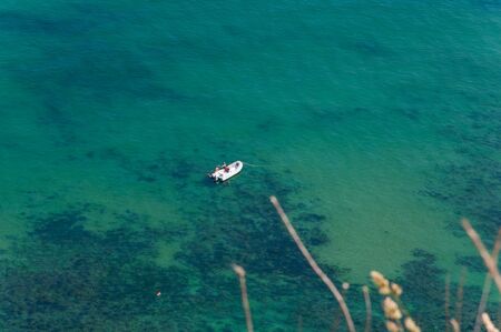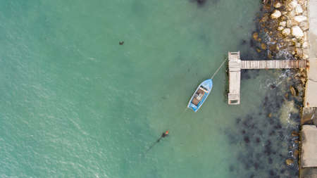 Yacht on the sea. Turquoise water background from top view in the evening. Summer seascape from air. Travel concept and idea