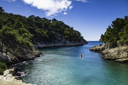 Aerial panoramic view of seascape with crystal clear azure sea and rocky shores. Yachts in a beautiful lagoon on backdrop of rocks. The concept of an ideal destination for summer travel and vacation.