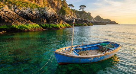 A small, weathered blue wooden boat with a single mast is gently bobbing in crystal clear turquoise water. The boat is anchored near a rocky coastline adorned with vibrant green moss and sparse trees. The sun's warm light illuminates the scene, creating a peaceful and picturesque maritime setting. The clear water reveals the seabed below.