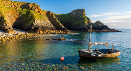 Tranquil coastal cove with blue fishing boat on sandy beach and rocky cliffs