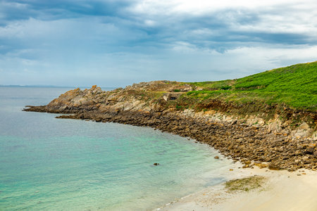Breathtaking view of turquoise water gently washing against a rocky coastline in Landunvez, Brittany, France, creating a serene coastal landscape