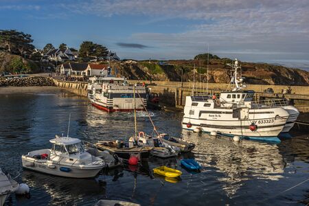 Houat, France ? ?? November 3, 2018 The passengers ready for the boarding on ferry in Saint-Gildas-Houat Port, moored board are at foreground.