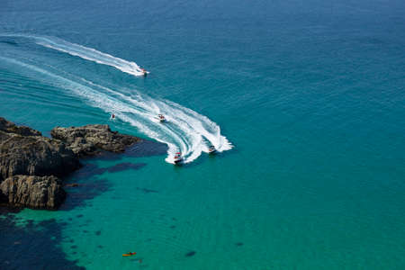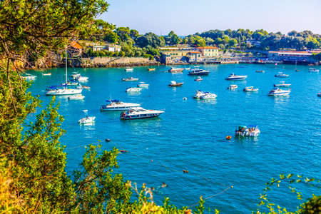 Pleasure boats approach the beautiful lagoon. View from the top of the cliff. Azure-emerald green sea water on a sunny day. High quality photo