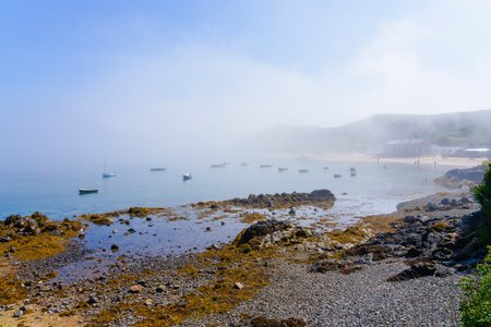 Blue sky begins to break through a low bank of coastal fog that sits over the fishing village of Porthdinllaen, Wales.