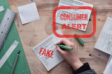 Fake covid vaccination record card. Forgery of health certificate confirming vaccinations against covid-19. Printed blank cards, pen, scissors, paper knife and laminator on old dirty wood, flat lay