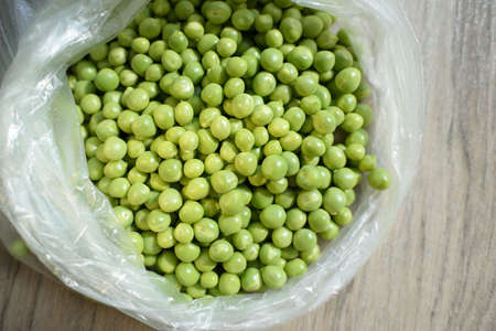 fresh peeled green peas are in a bag on the table. stubs of green peas. peeled fresh green peas.food for vegetarians.