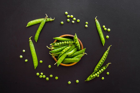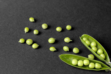 Fresh green peas on a dark background. Top view, flat lay
