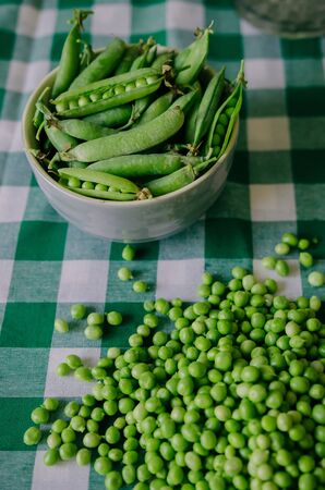 Green peas on a green tablecloth in the kitchen