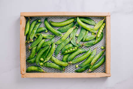 Fresh peas in a wooden tray on a marble background, flat lay, top view