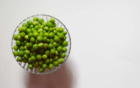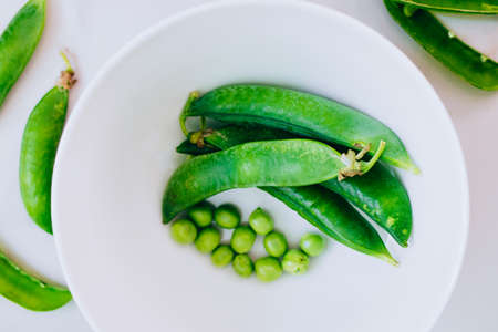 Green fresh peas in a white plate on a white table. High quality photo