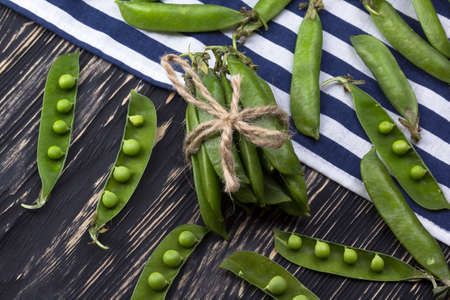 Top view of green pea pods and peas on the kitchen background
