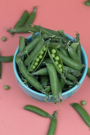 Fresh harvested peas on a light blue platter on a pink table