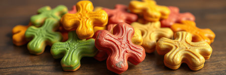 Colorful cross-shaped candies scattered on a wooden table during a celebration or gathering