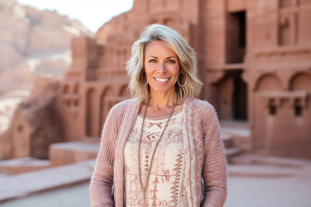 Portrait of a beautiful middle-aged woman in front of a castle in the desert