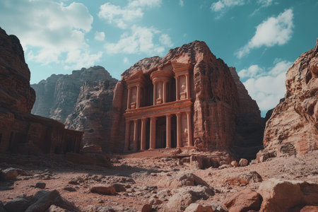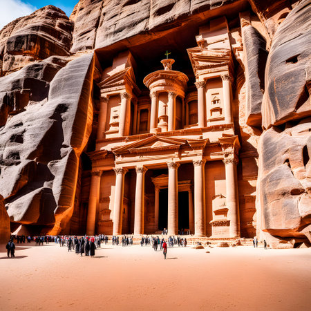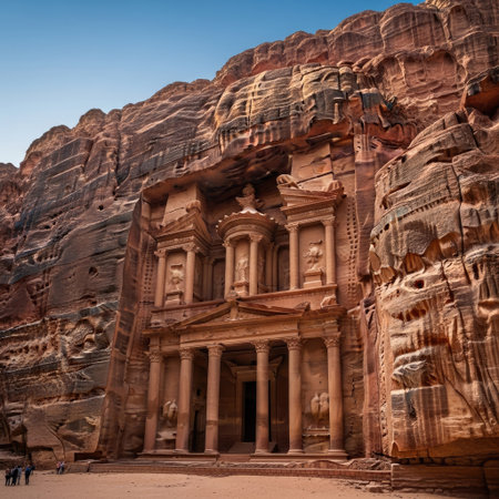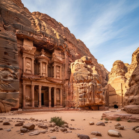 Stunning view of al khazneh in petra, jordan, featuring intricate carvings and a vibrant sky.
