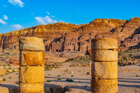 Panoramic view of Petra Royal Tombs including Urn Tomb, Silk Tomb, Corinthian Tomb and Palace Tomb carved into sandstone cliffs. Famous Nabataean burial monuments, UNESCO World Heritage site