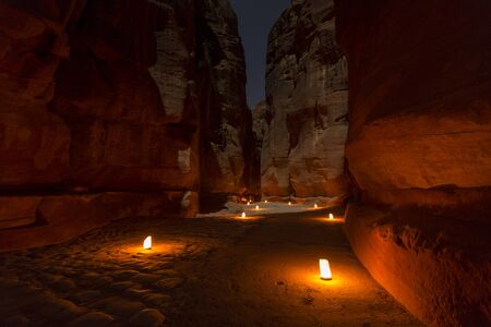Petra by night tour featuring illuminated Al Khazneh tomb also called Treasury at Petra, Jordan